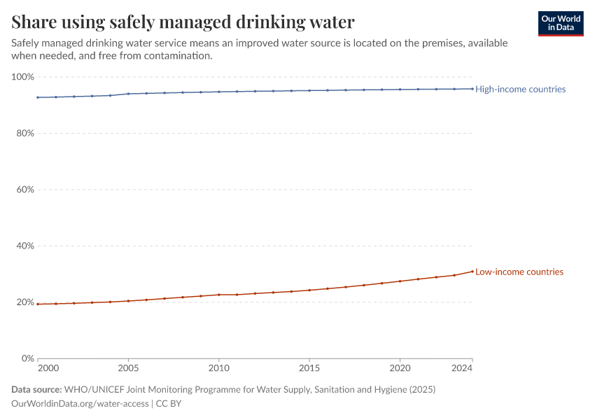 WHO/UNICEF Joint Monitoring Programme for Water Supply, Sanitation and Hygiene (2025) – processed by Our World in Data. “Share using safely managed drinking water” [dataset]. World Health Organization/UNICEF Joint Monitoring Programme for Water Supply, Sanitation and Hygiene, “WHO/UNICEF Joint Monitoring Programme for Water Supply, Sanitation and Hygiene (JMP) 2000-2024 report” [original data]. Retrieved March 11, 2026 from https://gdocs-bespoke-component.owid.pages.dev/grapher/proportion-using-safely-managed-drinking-water