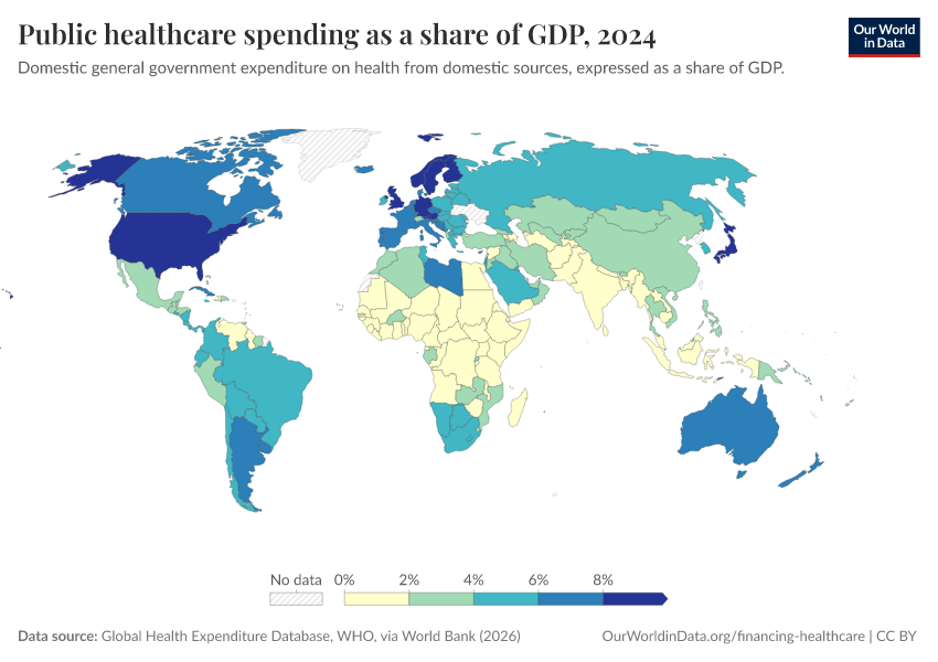 “Data Page: Public healthcare spending as a share of GDP”. Our World in Data (2026). Data adapted from Global Health Expenditure Database, WHO, via World Bank. Retrieved from https://gdocs-bespoke-component.owid.pages.dev/grapher/public-healthcare-spending-share-gdp [online resource]How to cite this data