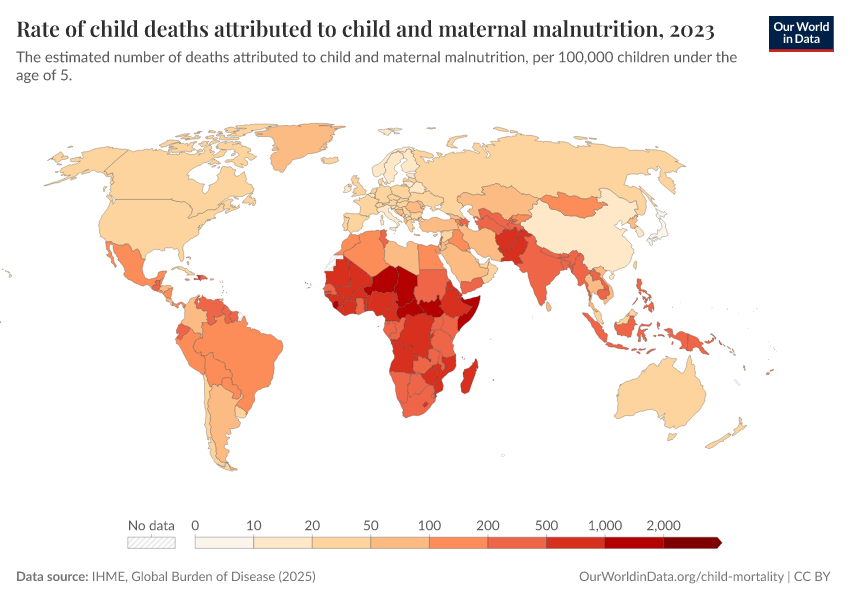 IHME, Global Burden of Disease (2025) – with major processing by Our World in Data. “Rate of child deaths attributed to child and maternal malnutrition” [dataset]. IHME, Global Burden of Disease, “Global Burden of Disease - Risk Factors - Deaths” [original data]. Retrieved March 11, 2026 from https://gdocs-bespoke-component.owid.pages.dev/grapher/rate-of-child-deaths-attributed-to-child-and-maternal-malnutrition