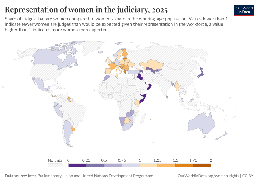“Data Page: Representation of women in the judiciary”. Our World in Data (2026). Data adapted from Inter-Parliamentary Union and United Nations Development Programme. Retrieved from https://gdocs-bespoke-component.owid.pages.dev/grapher/representation-of-women-in-the-judiciary [online resource]How to cite this data