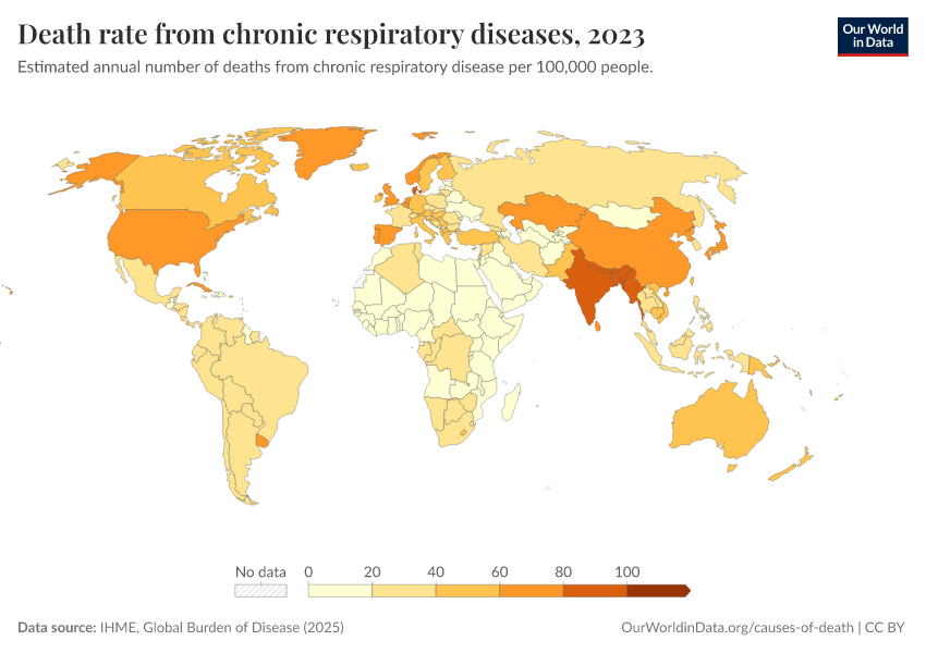 IHME, Global Burden of Disease (2025) – with major processing by Our World in Data. “Death rate from chronic respiratory diseases” [dataset]. IHME, Global Burden of Disease, “Global Burden of Disease - Deaths” [original data]. Retrieved March 11, 2026 from https://gdocs-bespoke-component.owid.pages.dev/grapher/respiratory-disease-death-rate-gbd