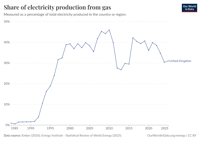 Ember (2026); Energy Institute - Statistical Review of World Energy (2025) – with major processing by Our World in Data. “Share of electricity generated by gas” [dataset]. Ember, “Yearly Electricity Data Europe”; Ember, “Yearly Electricity Data”; Energy Institute, “Statistical Review of World Energy” [original data]. Retrieved March 11, 2026 from https://gdocs-bespoke-component.owid.pages.dev/grapher/share-electricity-gas