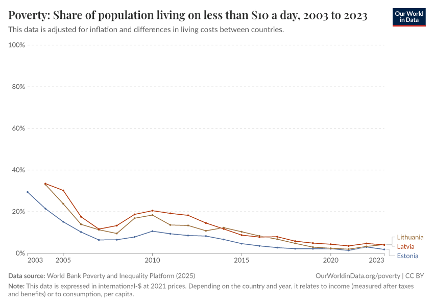 “Data Page: Poverty: Share of population living on less than $10 a day”, part of the following publication: Joe Hasell, Bertha Rohenkohl, Pablo Arriagada, Esteban Ortiz-Ospina, and Max Roser (2022) - “Poverty”. Data adapted from World Bank Poverty and Inequality Platform. Retrieved from https://gdocs-bespoke-component.owid.pages.dev/grapher/share-living-with-less-than-10-int--per-day [online resource]How to cite this data