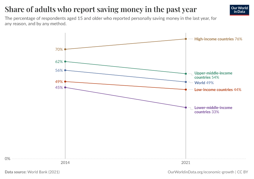 “Data Page: Share of adults who report saving money in the past year”, part of the following publication: Max Roser, Bertha Rohenkohl, Pablo Arriagada, Joe Hasell, Hannah Ritchie, and Esteban Ortiz-Ospina (2023) - “Economic Growth”. Data adapted from World Bank. Retrieved from https://gdocs-bespoke-component.owid.pages.dev/grapher/share-of-adults-who-report-saving-money-in-the-past-year [online resource]How to cite this data