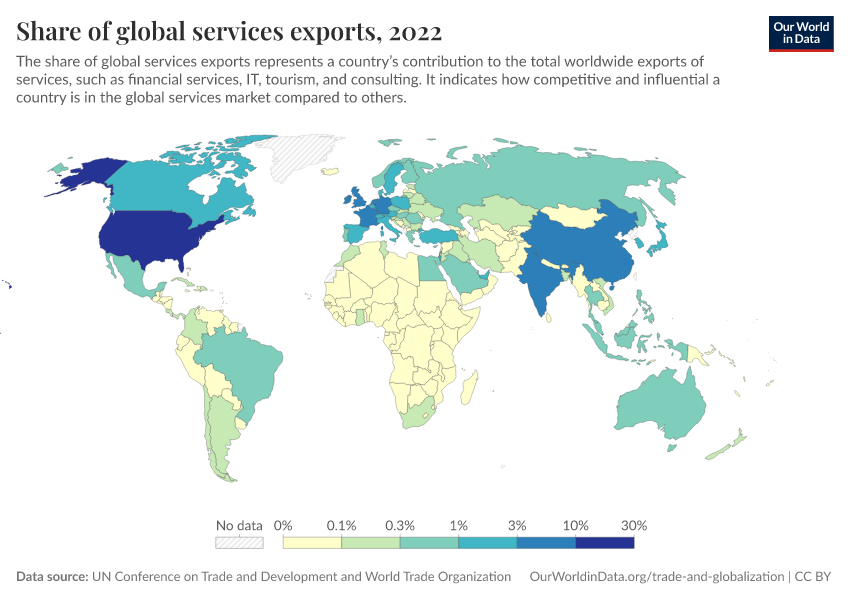 “Data Page: Share of global services exports”. Our World in Data (2026). Data adapted from UN Conference on Trade and Development and World Trade Organization. Retrieved from https://gdocs-bespoke-component.owid.pages.dev/grapher/share-of-global-services-exports [online resource]How to cite this data