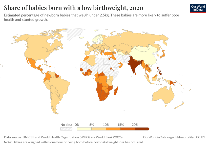 “Data Page: Share of babies born with a low birthweight”. Our World in Data (2026). Data adapted from UNICEF and World Health Organization (WHO), via World Bank. Retrieved from https://gdocs-bespoke-component.owid.pages.dev/grapher/share-of-low-birthweight-babies-born [online resource]How to cite this data