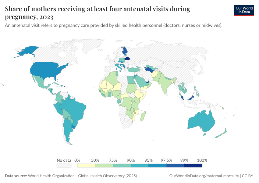 World Health Organization - Global Health Observatory (2025) – processed by Our World in Data. “Share of mothers receiving at least four antenatal visits during pregnancy” [dataset]. World Health Organization, “Global Health Observatory” [original data]. Retrieved March 11, 2026 from https://gdocs-bespoke-component.owid.pages.dev/grapher/share-of-mothers-receiving-at-least-four-antenatal-visits-during-pregnancy