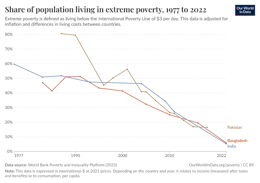 World Bank Poverty and Inequality Platform (2025) – with major processing by Our World in Data. “Share of population living in extreme poverty – World Bank” [dataset]. World Bank Poverty and Inequality Platform, “World Bank Poverty and Inequality Platform (PIP) 20250930_2021, 20250930_2017” [original data]. Retrieved March 11, 2026 from https://gdocs-bespoke-component.owid.pages.dev/grapher/share-of-population-in-extreme-poverty