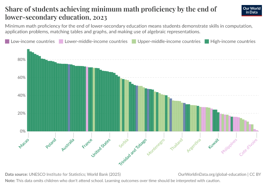 UNESCO Institute for Statistics – processed by Our World in Data. “Share of students achieving minimum math proficiency by the end of lower-secondary education” [dataset]. UNESCO Institute for Statistics, “Data from multiple sources” [original data]. Retrieved March 11, 2026 from https://gdocs-bespoke-component.owid.pages.dev/grapher/share-of-students-at-end-of-lower-secondary-education-achieving-minimum-math-proficiency