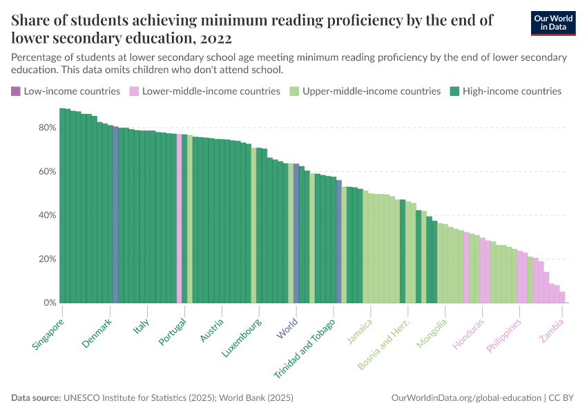 “Data Page: Share of students achieving minimum reading proficiency by the end of lower secondary education”, part of the following publication: Hannah Ritchie, Veronika Samborska, Esteban Ortiz-Ospina, and Max Roser (2023) - “Global Education”. Data adapted from UNESCO Institute for Statistics. Retrieved from https://gdocs-bespoke-component.owid.pages.dev/grapher/share-of-students-at-end-of-lower-secondary-education-with-minimum-reading-proficiency [online resource]How to cite this data