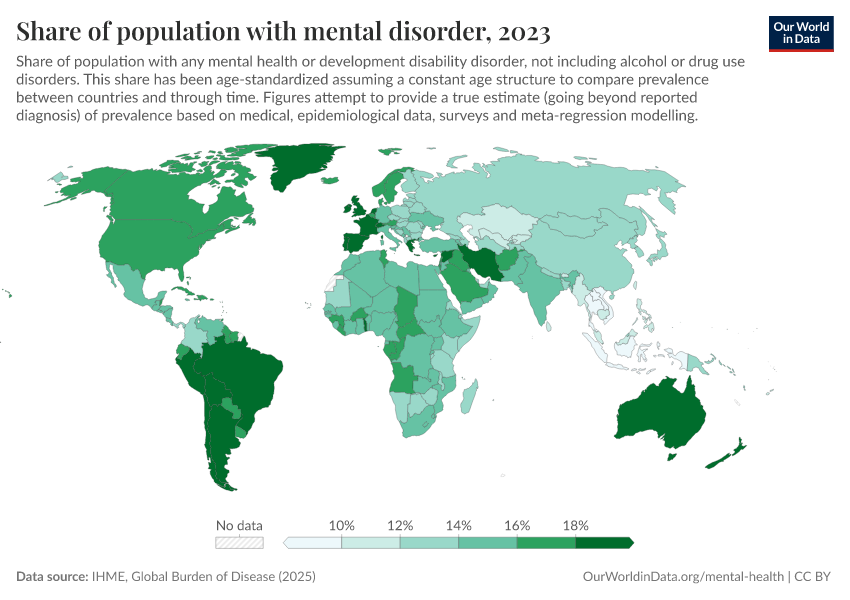 IHME, Global Burden of Disease (2025) – with major processing by Our World in Data. “Share of population with mental disorder” [dataset]. IHME, Global Burden of Disease, “Global Burden of Disease - Mental Health Prevalence” [original data]. Retrieved March 11, 2026 from https://gdocs-bespoke-component.owid.pages.dev/grapher/share-with-mental-health-or-development-disorder