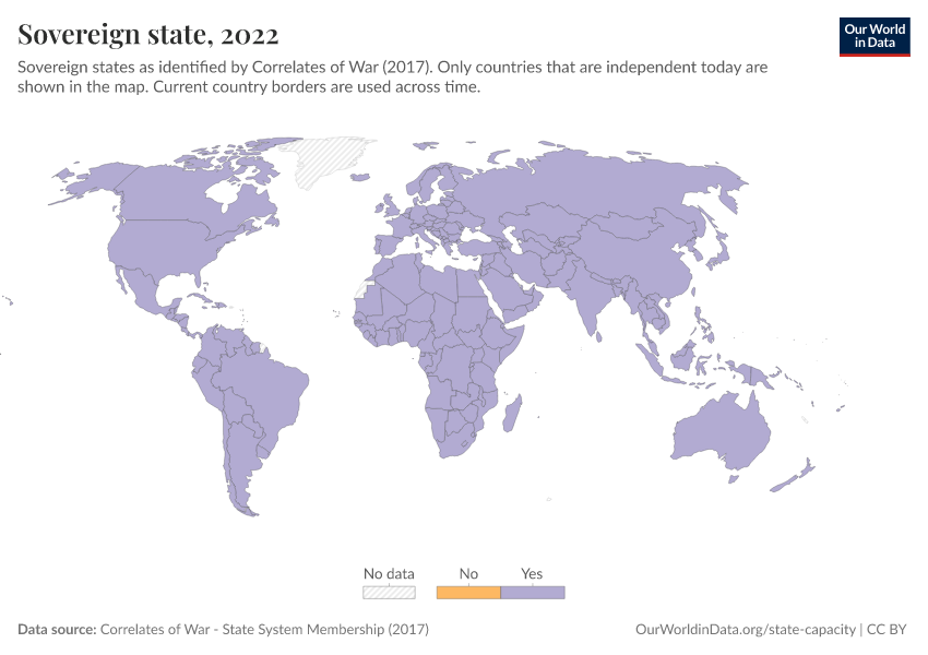 “Data Page: Sovereign state”, part of the following publication: Bastian Herre and Pablo Arriagada (2023) - “State Capacity”. Data adapted from Correlates of War. Retrieved from https://gdocs-bespoke-component.owid.pages.dev/grapher/sovereign-state-cow [online resource]How to cite this data