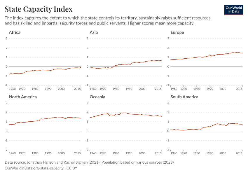 “Data Page: State Capacity Index”, part of the following publication: Bastian Herre and Pablo Arriagada (2023) - “State Capacity”. Data adapted from Jonathan Hanson and Rachel Sigman, Various sources. Retrieved from https://gdocs-bespoke-component.owid.pages.dev/grapher/state-capacity-index [online resource]How to cite this data