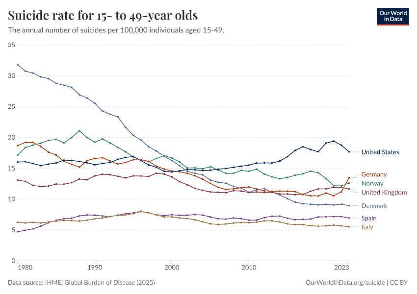 IHME, Global Burden of Disease (2025) – with major processing by Our World in Data. “Suicide rate for 15- to 49-year olds” [dataset]. IHME, Global Burden of Disease, “Global Burden of Disease - Deaths” [original data]. Retrieved March 11, 2026 from https://gdocs-bespoke-component.owid.pages.dev/grapher/suicide-rate-for-15--to-49-year-olds