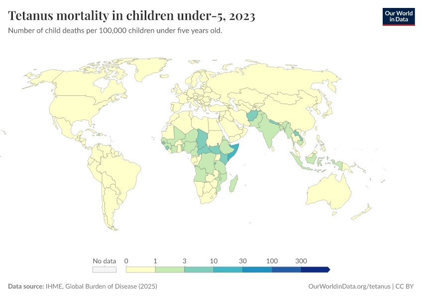 IHME, Global Burden of Disease (2025) – with major processing by Our World in Data. “Tetanus mortality in children under-5” [dataset]. IHME, Global Burden of Disease, “Global Burden of Disease - Deaths” [original data]. Retrieved March 11, 2026 from https://gdocs-bespoke-component.owid.pages.dev/grapher/tetanus-mortality-in-children-under-5