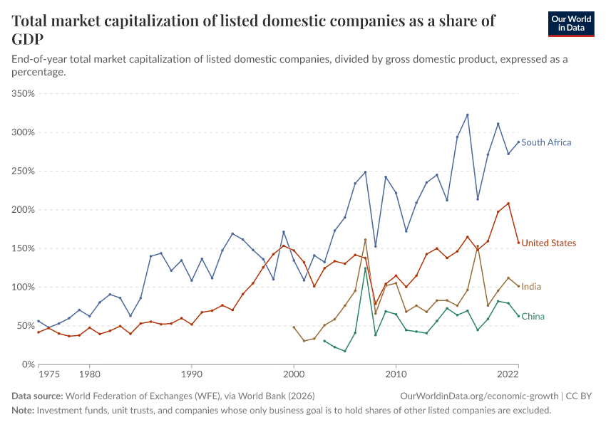 “Data Page: Total market capitalization of listed domestic companies as a share of GDP”. Our World in Data (2026). Data adapted from World Federation of Exchanges (WFE), via World Bank. Retrieved from https://gdocs-bespoke-component.owid.pages.dev/grapher/total-market-capitalization-listed-domestic-companies-share-gdp [online resource]How to cite this data