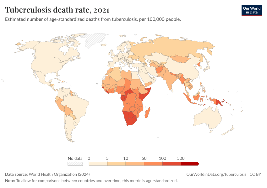 World Health Organization (2024) – with major processing by Our World in Data. “Tuberculosis death rate” [dataset]. World Health Organization, “Global Health Estimates” [original data]. Retrieved March 11, 2026 from https://gdocs-bespoke-component.owid.pages.dev/grapher/tuberculosis-death-rate-age-standardized
