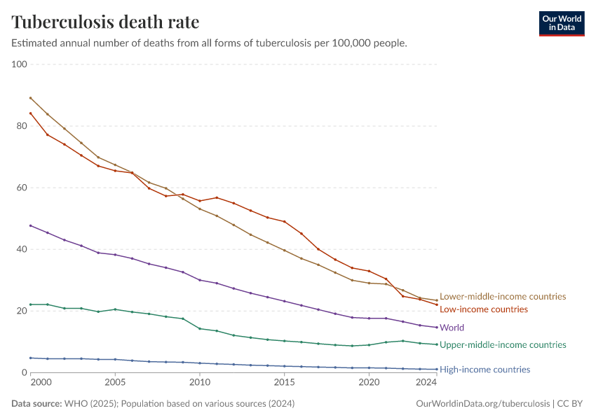 WHO (2025); Population based on various sources (2024) – with minor processing by Our World in Data. “Tuberculosis death rate” [dataset]. WHO, “Global Tuberculosis Report - Burden Estimates”; Various sources, “Population” [original data]. Retrieved March 11, 2026 from https://gdocs-bespoke-component.owid.pages.dev/grapher/tuberculosis-death-rate