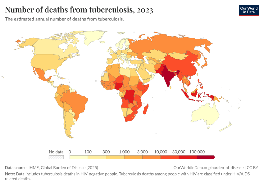 IHME, Global Burden of Disease (2025) – with major processing by Our World in Data. “Number of deaths from tuberculosis” [dataset]. IHME, Global Burden of Disease, “Global Burden of Disease - Deaths” [original data]. Retrieved March 11, 2026 from https://gdocs-bespoke-component.owid.pages.dev/grapher/tuberculosis-deaths