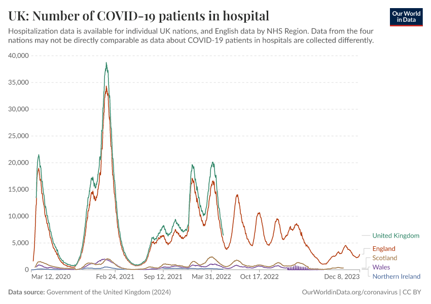 Government of the United Kingdom (2024) – with minor processing by Our World in Data. “UK: Number of COVID-19 patients in hospital” [dataset]. Government of the United Kingdom, “UKHSA data dashboard” [original data]. Retrieved March 11, 2026 from https://gdocs-bespoke-component.owid.pages.dev/grapher/uk-covid-hospital-patients