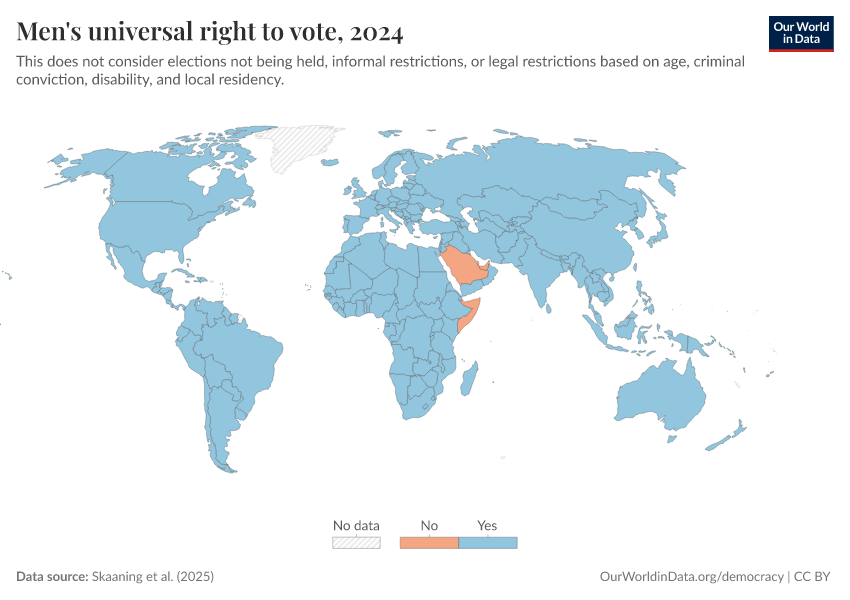 Skaaning et al. (2025) – processed by Our World in Data. “Men's universal right to vote” [dataset]. Skaaning et al., “Lexical Index of Electoral Democracy (LIED) v6.8” [original data]. Retrieved March 11, 2026 from https://gdocs-bespoke-component.owid.pages.dev/grapher/universal-suffrage-men-lexical