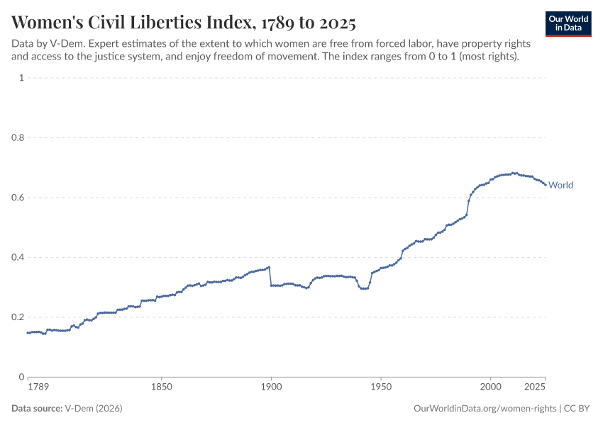 V-Dem (2025) – processed by Our World in Data. “Women's civil rights index – V-Dem” [dataset]. V-Dem, “Democracy report v15” [original data]. Retrieved March 11, 2026 from https://gdocs-bespoke-component.owid.pages.dev/grapher/women-civil-liberties-index