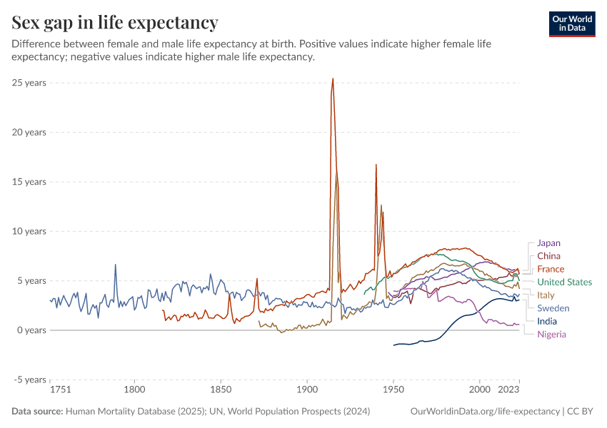 On this page, you will find global data and research on life expectancy and related measures of longevity: the probability of death at a given age, the sex gap in life expectancy, lifespan inequality within countries, and more.