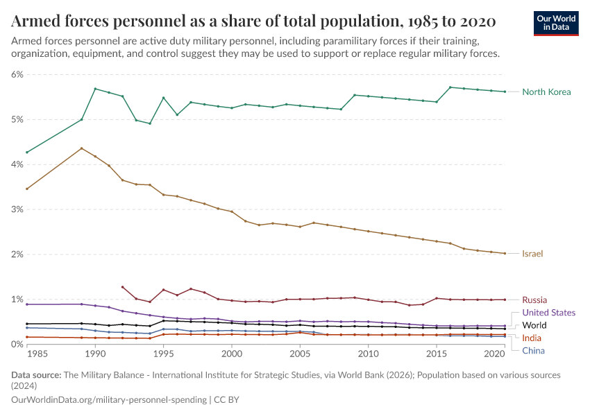 The last chart plots armed forces personnel across countries and world regions. Again there is a broad negative trend in most countries. And these trends also hold if we look at the armed forces as share of labor force.