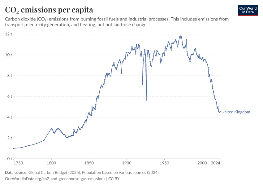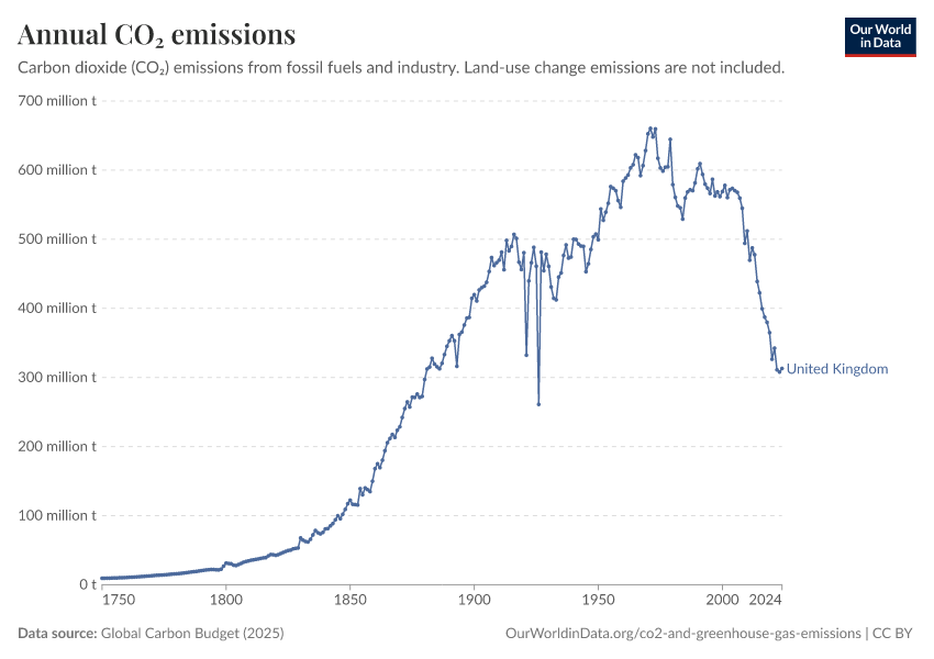 Hannah Ritchie and Pablo Rosado (2025) - “CO₂ and Greenhouse Gas Emissions” Published online at OurWorldinData.org. Retrieved from: 'https://gdocs-bespoke-component.owid.pages.dev/profile/co2/united-kingdom' [Online Resource]BibTeX citation