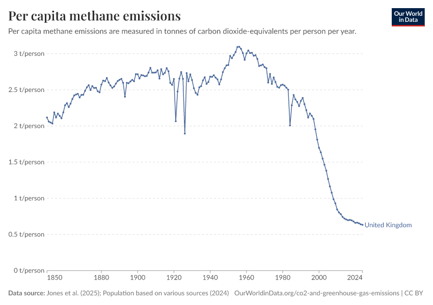 This first interactive chart here shows per capita emissions of methane each year. This is measured in ‘carbon dioxide equivalents’.