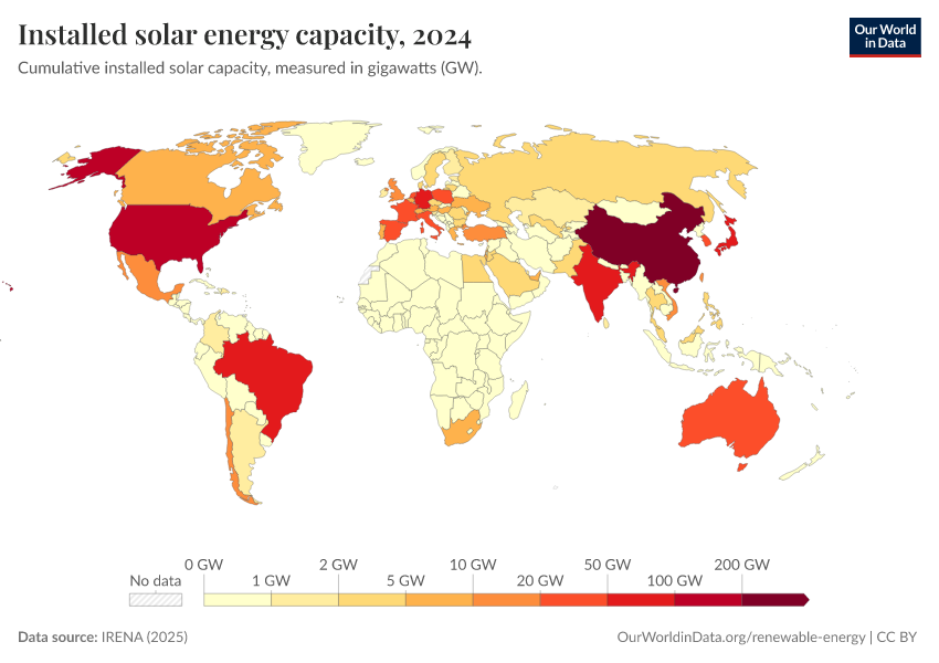 Energy generation is therefore a function of how much solar capacity is installed. This interactive chart shows installed solar capacity across the world.