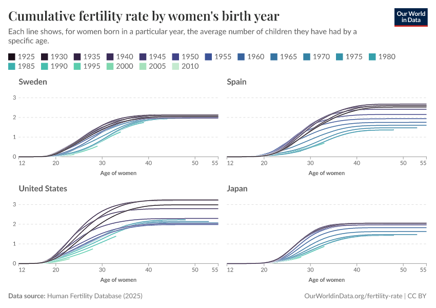 Now you can see that in Sweden, although the curves are pushed towards the right (meaning that childbirths have been delayed), eventually, each cohort reached a cumulative fertility rate of 2 births per woman. This reflects a tempo effect but not a quantum effect.