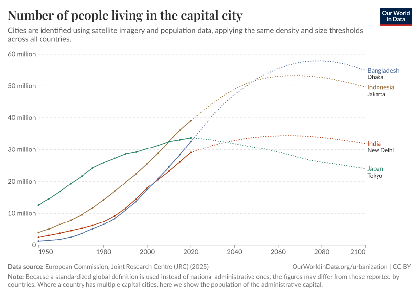 In the chart below we see the world mapped based on the population of each country's capital city. This data comes from the European Commission’s GHSL project, which standardizes city population definitions using consistent criteria based on density and size. In 2020, Indonesia’s capital — Jakarta — had the largest population of the world's capital cities at over 38 million people. This was followed by Tokyo (Japan) at over 33 million; Dhaka (Bangladesh) at 32 million; and New Delhi (India) at 29 million.