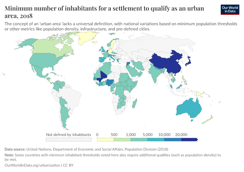 There is no universal definition of what constitutes an 'urban area'. Definitions of an urban settlement vary widely across countries, both in terms of the metrics used to define them, and their threshold level. The UN World Urbanization Prospects (2018) database provides a downloadable list of underlying data sources and the statistical concepts used to define 'urban' by country.5