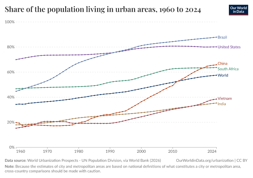 Hannah Ritchie, Veronika Samborska, and Max Roser (2024) - “Urbanization” Published online at OurWorldinData.org. Retrieved from: 'https://gdocs-bespoke-component.owid.pages.dev/urbanization' [Online Resource]BibTeX citation