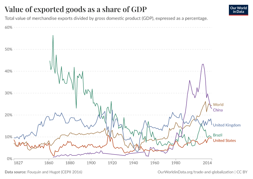 One of the key additions to the topic page are new charts exploring long-run trade estimates across countries and world regions. Here is an example: merchandise export-to-GDP ratios from 1827 up until 2014.